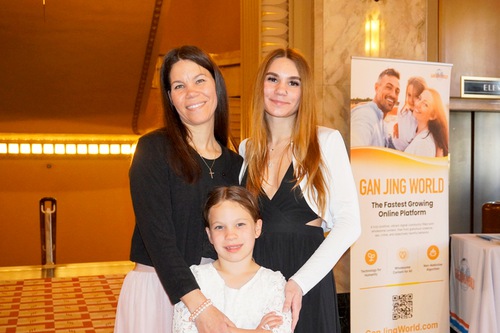 Nel pomeriggio del 21 marzo, l'insegnante di danza americana Linda Dawes (a sinistra) e le sue due figlie hanno assistito allo spettacolo di Shen Yun a St. Louis, nel Missouri (Schermata per gentile concessione di The Epoch Times)