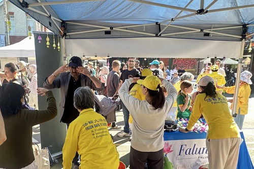 La musica potente, caratteristica e commovente della banda, ha segnato l’inizio del carnevale, mentre l’esibizione energica del gruppo di tamburini ha portato un’atmosfera gioiosa all’evento. Molte persone si sono fermate allo stand della Falun Dafa, alcuni hanno elogiato i principi della Falun Dafa di Verità-Compassione-Tolleranza, mentre altri hanno imparato gli esercizi.